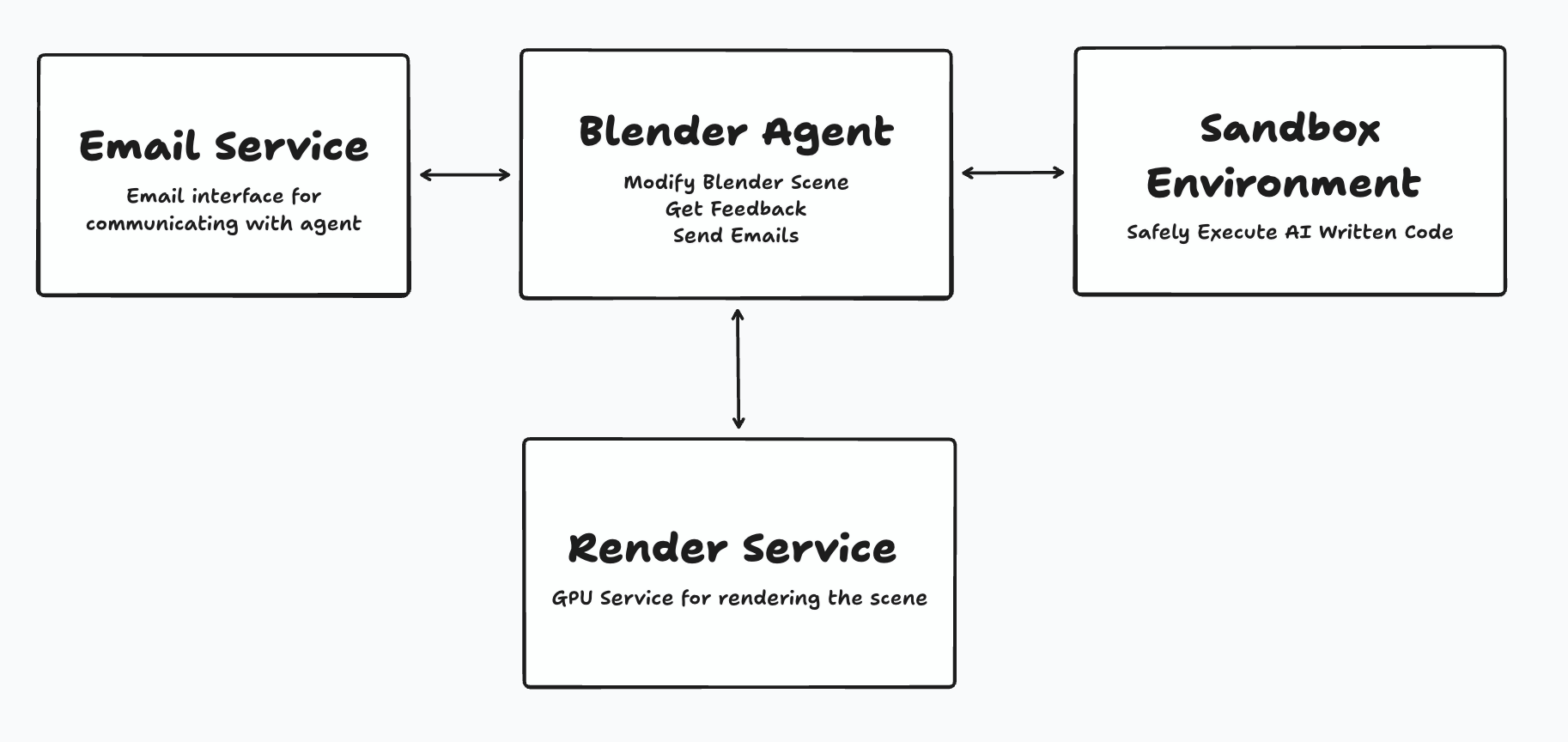 Thankfully, Blender has built-in support for Python. Within Blender you can execute Python code to inspect and modify the scene. Given this, we know the core component of the application will be a code-generation agent. The industry-standard practice is to assume AI-written code could be malicious and to execute it only in a sandboxed environment isolated from the rest of the application code. This sandbox will also need to have Blender available.