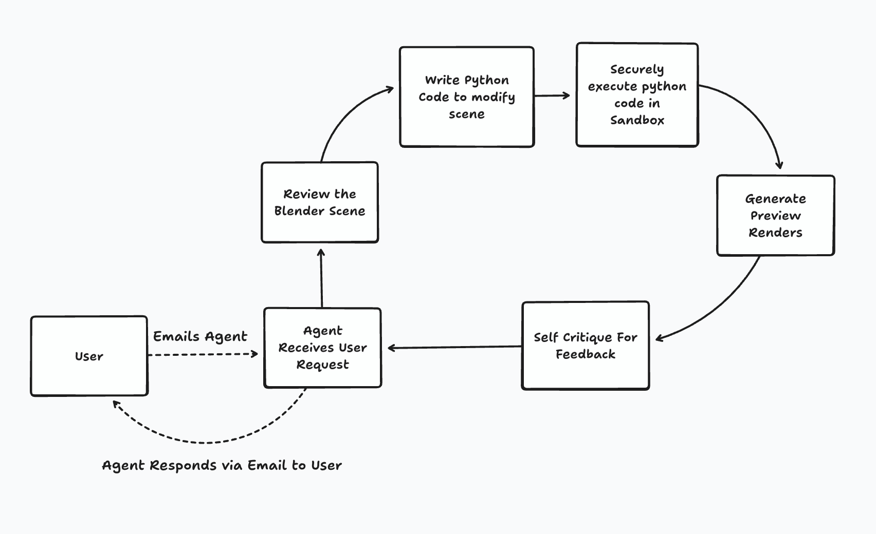 We connected the remaining pieces: ephemeral sandboxes for secure execution, GPU rendering infrastructure, and email parsing. This completed the full loop: email input → preview generation → iteration → final render delivery.