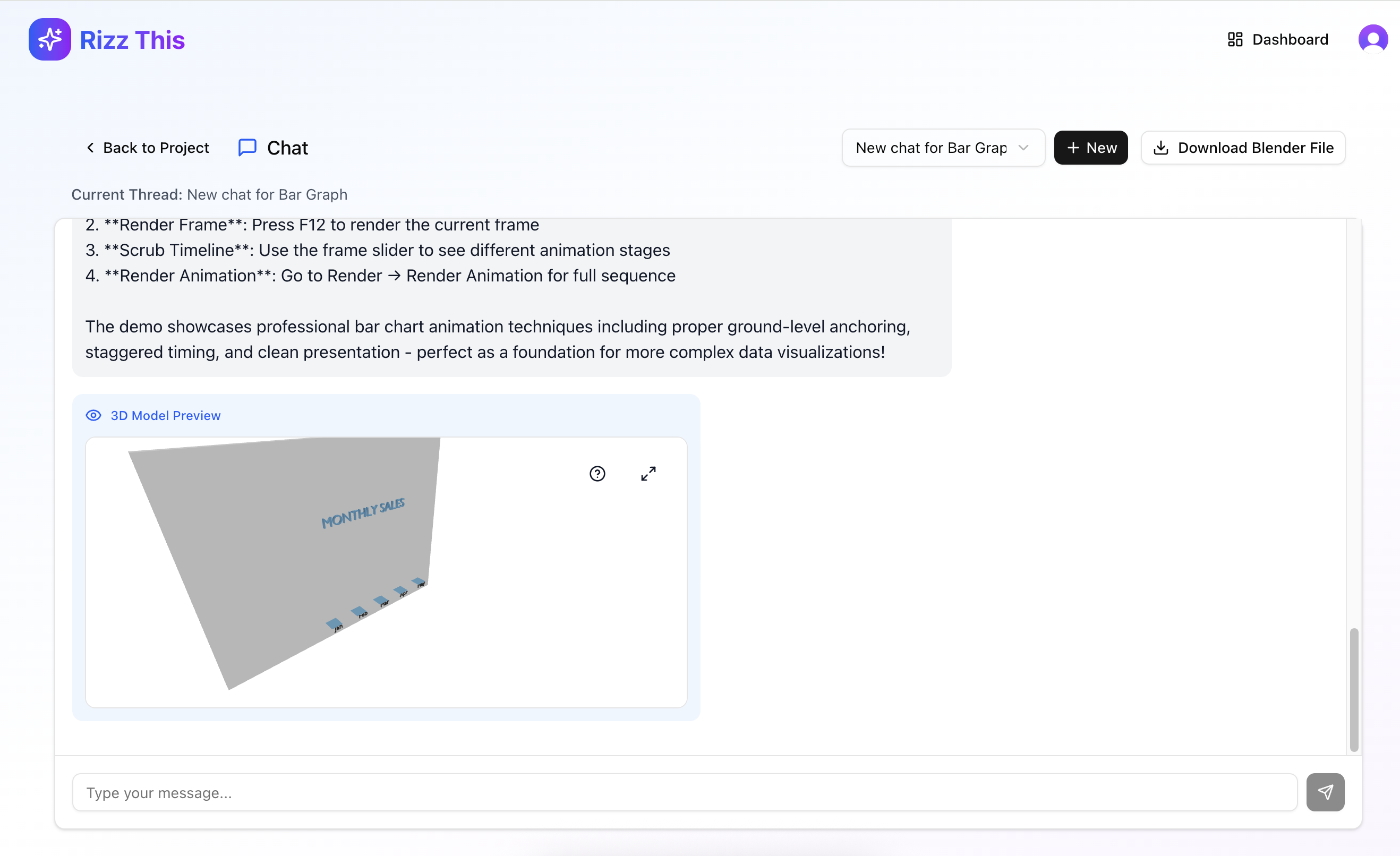While we were working on this, we realized that a nice feature to have would be showing the preview in the browser, if that was possible. We were able to export the Blender file and make it accessible in a format that could render in the browser, and we were able to incorporate this browser preview functionality. This screenshot of the chat interface shows what a user could see if they wanted to preview it in chat, although email is the primary interface.